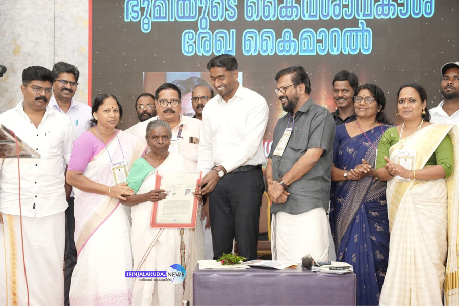 വെള്ളാങ്കല്ലൂര് ബ്ലോക്ക് പഞ്ചായത്തിനെ സമ്പൂര്ണ ഭരഘടന സാക്ഷരത ബ്ലോക്ക് ആയി പ്രഖ്യാപിച്ച ചടങ്ങില് കല്ലങ്കുന്ന് പട്ടികവര്ഗ ഉന്നതിയിലെ നിവാസികള്ക്ക് ഭൂമിയുടെ കൈവശാവകാശ രേഖ ജില്ലാ കളക്ടര് അര്ജുന് പാണ്ഡ്യന് കൈമാറുന്നു.