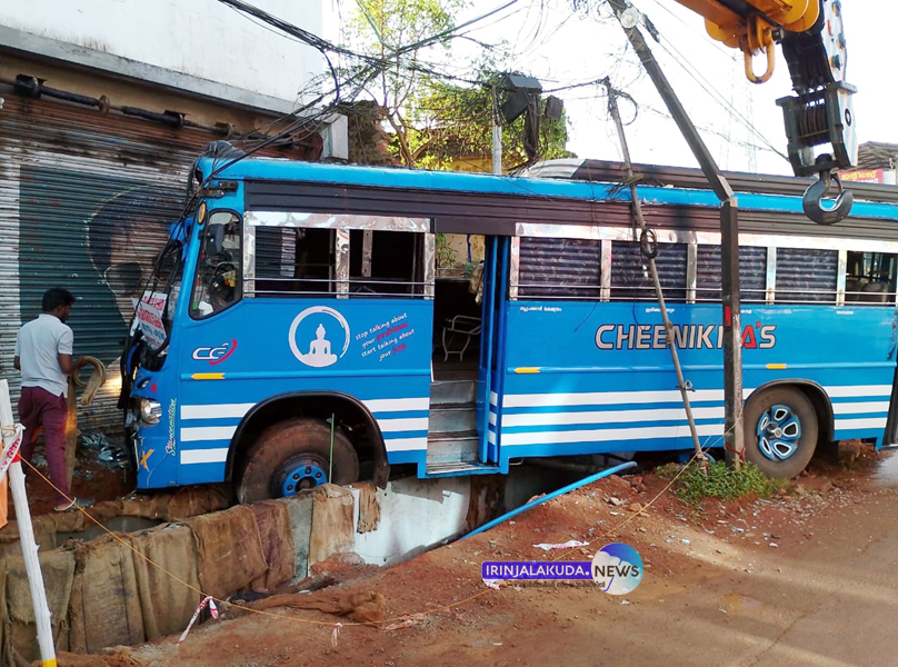 ഇരിങ്ങാലക്കുട ഠാണാവില് നിയന്ത്രണം വിട്ട സ്വകാര്യ ബസ് നിര്മ്മാണം നടക്കുന്ന കാനയിലേയ്ക്ക് ഇടിച്ച് കയറി അപകടം സംഭവിച്ച നിലയില്.