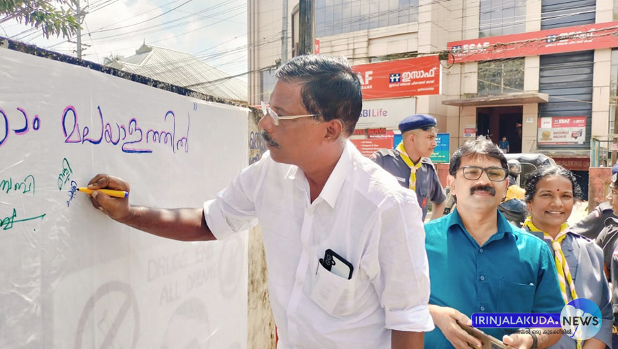 ഇരിങ്ങാലക്കുട നഗരസഭ വാര്ഡ് കൗണ്സിലറും മുന് നഗരസഭ വൈസ് ചെയര്മാനുമായിരുന്ന ടി.വി. ചാര്ളി സ്കൂളിന് മുന് വശത്ത് തയ്യറാക്കിയ ക്യാന്വാസില് മലയാളത്തില് ഒപ്പ് രേഖപ്പെടുത്തി കൊണ്ട് പരിപാടി ഉദ്ഘാടനം ചെയ്തു. പ്രിന്സിപ്പല് എം.കെ. മുരളി, എന്എസ്എസ് പ്രോഗ്രാം ഓഫീസര് എന്.വി. വിനുകുമാര്, റോവര് ലീഡര് കെ.എ. ഷീന, റേഞ്ചര് ലീഡര് കെ.ജി. സുലോചന എന്നിവര് പ്രസംഗിച്ചു.