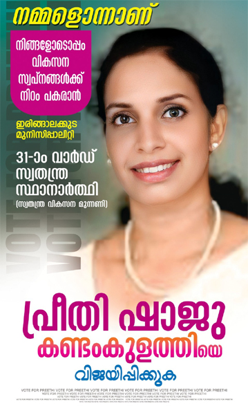 ഇരിങ്ങാലക്കുട: കുഴികളില്ലാത്ത റോഡ് വാഗ്ദാനം ചെയ്ത് ഇരിങ്ങാലക്കുടയില് സ്വതന്ത്ര വികസന മുന്നണി. പ്രീതി ഷാജുവാണ് 31ാം വാര്ഡില് സ്വതന്ത്ര വികസന മുന്നണി സ്ഥാനാര്ഥിയായി മത്സരിക്കുന്നത്. ക്രൈസ്റ്റ് വിദ്യാനികേതന് സ്കൂള് റോഡ്, മാസ് തിയറ്റര് റോഡ്, ക്രൈസ്റ്റ് കോളജ് റോഡ്, ബൈപ്പാസ് റോഡ് തുടങ്ങി വാര്ഡിലെ പ്രധാന റോഡുകളെല്ലാം മൂന്നുവര്ഷമായി തകര്ന്നു കിടക്കുമ്പോഴാണ്, അവസരം തന്നാല് തന്റെ വാര്ഡില് റോഡില് കുഴികള് ഉണ്ടാവില്ല എന്നുള്ള പ്രഖ്യാപനം.