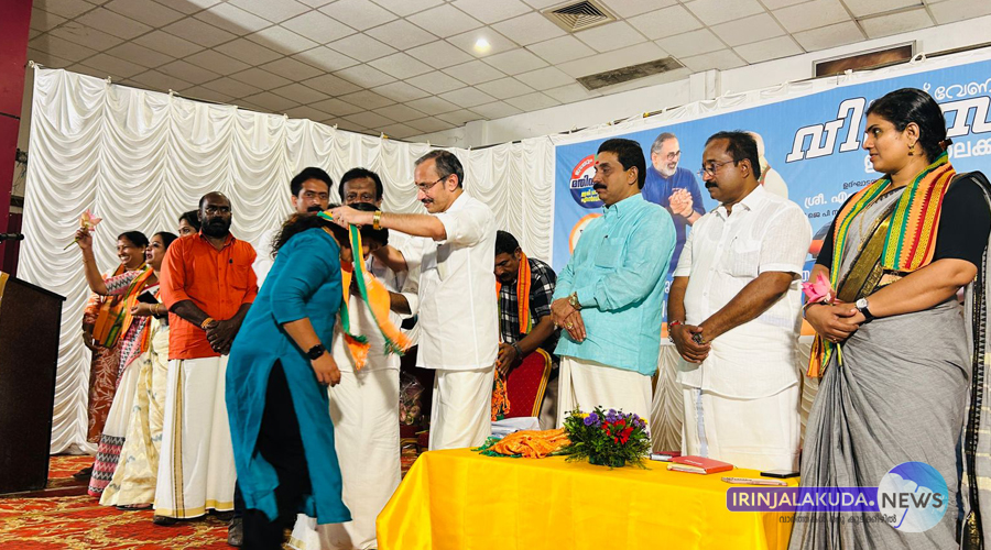 ഇരിങ്ങാലക്കുട മുനിസിപ്പാലിറ്റി എന്ഡിഎ സ്ഥാനാര്ഥി കണ്വെന്ഷനില് സ്ഥാനാര്ഥികളെ ബിജെപി സംസ്ഥാന ജനറല് സെക്രട്ടറി എം.ടി. രമേശ് പൊന്നാടയണിയിച്ച് സ്വീകരിക്കുന്നു.