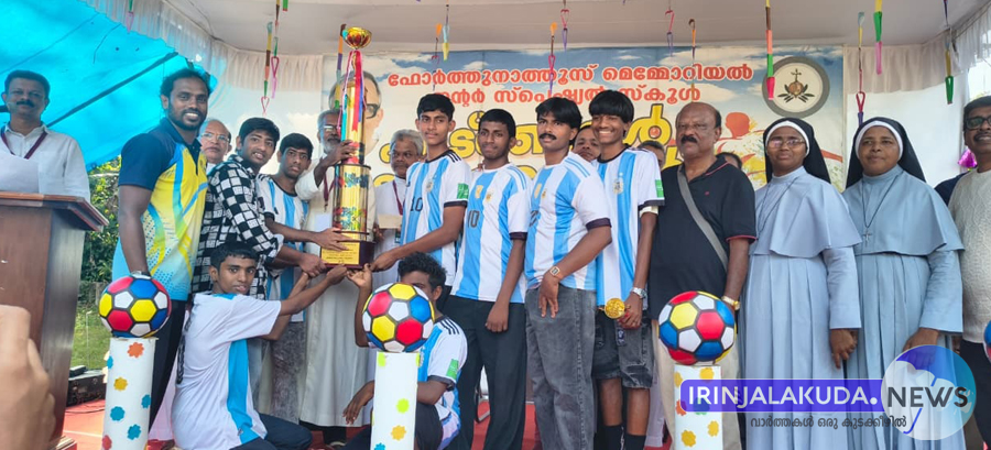 ഇരിങ്ങാലക്കുട: കോട്ടയം പാമ്പാടി സെന്റ് ജോണ് ഓഫ് ഗോഡ് സ്പെഷ്യല് സ്കൂളില് വച്ച് നടന്ന അഖില കേരള സ്പെഷ്യല് സ്കൂള് ഫുട്ബോള് മത്സരത്തില് രണ്ടാം സ്ഥാനം കരസ്ഥമാക്കിയ ഇരിങ്ങാലക്കുട പ്രതീക്ഷ ട്രെയിനിംഗ് സെന്റര് വിദ്യാര്ഥികള് ട്രോഫിയും കാഷ് അവാര്ഡും ഏറ്റുവാങ്ങുന്നു.