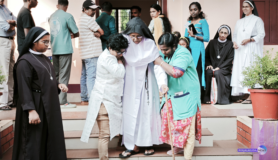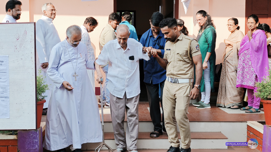ഇരിങ്ങാലക്കുട ലിറ്റില് ഫ്ളവര് സ്കൂളില് വോട്ട് ചെയ്യാന് എത്തിയ പ്രായം ചെന്ന വ്യക്തിയെ ബിഷപ്പ്് മാര് പോളി കണ്ണൂക്കാടന് സഹായിക്കുന്നു.