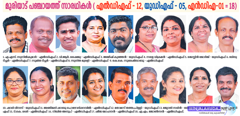 മുരിയാട് പഞ്ചായത്ത് സാരഥികള് (എല്ഡിഎഫ് – 12, യുഡിഎഫ് – 05, എന്ഡിഎ – 01, ആകെ 18)