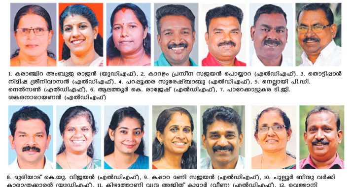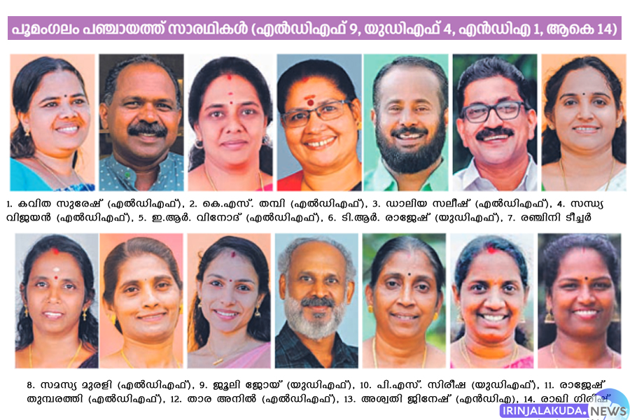പൂമംഗലം പഞ്ചായത്ത് സാരഥികള് (എല്ഡിഎഫ് 09, യുഡിഎഫ് 04, എന്ഡിഎ 01, ആകെ 14)