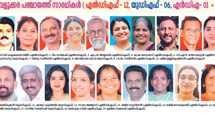 വേളൂക്കര പഞ്ചായത്ത് സാരഥികള് (എല്ഡിഎഫ് 12, യുഡിഎഫ് 6, എന്ഡിഎ 1, ആകെ 19)