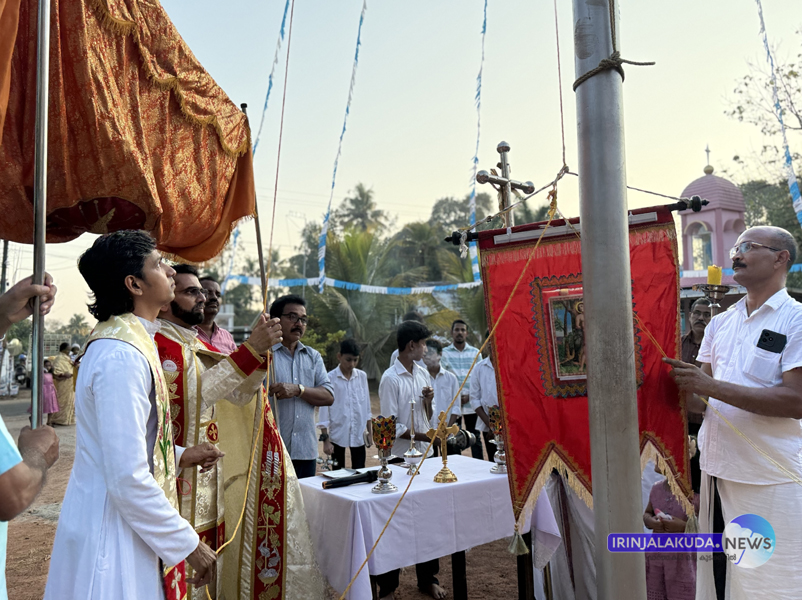 കാറളം ഹോളിട്രിനിറ്റി ദേവാലയത്തിലെ അമ്പു തിരുനാളിന് ഇരിങ്ങാലക്കുട രൂപത ചാന്സലര് ഫാ. കിരണ് തട്ട്ല കൊടിയേറ്റുന്നു. വികാരി ഫാ. ജീസന് കാട്ടുക്കാരന് സമീപം.