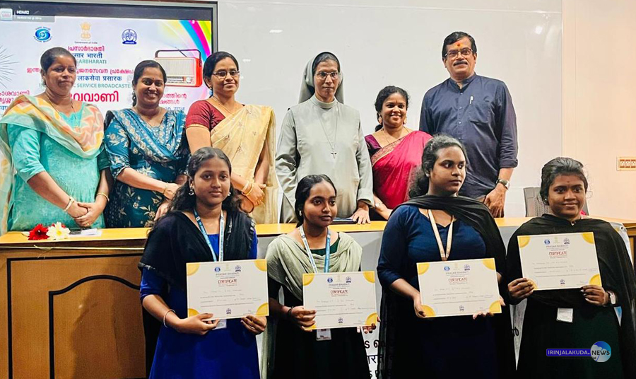 ആകാശവാണിയുടെ 90-ാം വാര്ഷികത്തോടനുബന്ധിച്ചുള്ള യൂത്ത് ഔട്ട്റീച്ചിന്റെ ഭാഗമായി തൃശൂര് ആകാശവാണിയും ഇരിങ്ങാലക്കുട സെന്റ് ജോസഫ്സ് കോളജിലെ മലയാള വിഭാഗവും സംയുക്തമായി സംഘടിപ്പിച്ച പ്രശ്നോത്തരി മത്സരത്തില് വിജയികളായവര്.