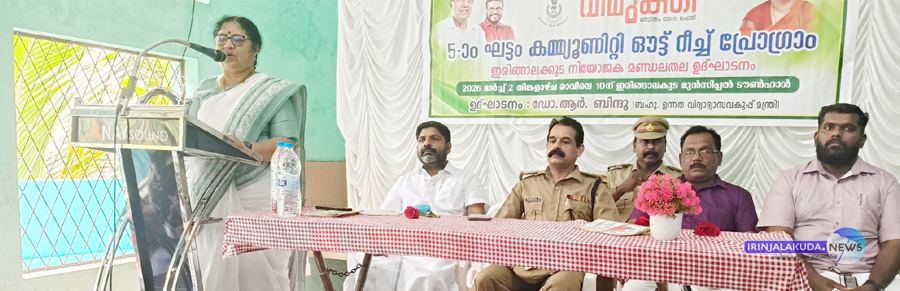 ഇരിങ്ങാലക്കുട: ലഹരിക്കെതിരെ സേ നോ ടു ഡ്രഗ്സ് ക്യാമ്പയിനിന്റെ ഭാഗമായി ഇരിങ്ങാലക്കുട നിയോജകമണ്ഡലം തല അഞ്ചാംഘട്ട കമ്മ്യൂണിറ്റി ഔട്ട് റീച്ച് പ്രോഗ്രാം മന്ത്രി ആര്. ബിന്ദു ഉദ്ഘാടനം ചെയ്തു. നഗരസഭ വിദ്യാഭ്യാസകാര്യ സ്ഥിരസമിതി അധ്യക്ഷന് വി.സി വര്ഗീസ് അധ്യക്ഷത വഹിച്ചു.