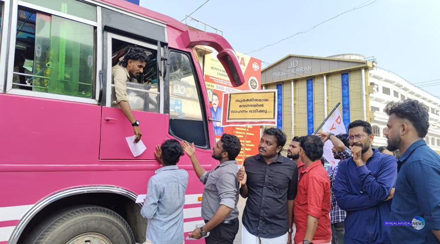 ഇരിങ്ങാലക്കുട ബസ്റ്റാന്റില് ഡിവൈഎഫ്്ഐ യുടെ നേതൃത്വത്തില് ബസ് ജീവനക്കാര്ക്ക് മുന്നറിയിപ്പുമായി ലഘുലേഖകള് നല്കുന്നു.