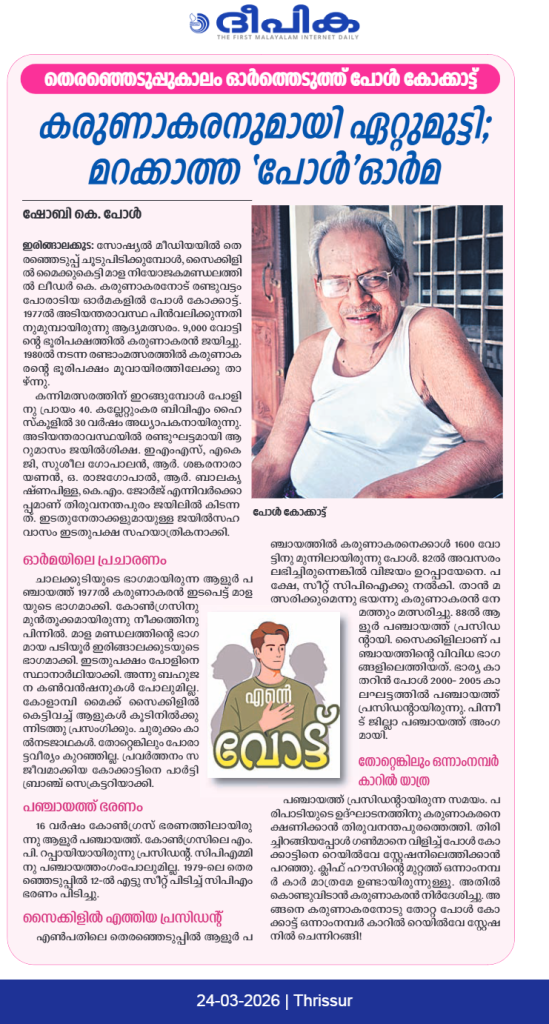 ആളൂര്: ഇന്ന് സോഷ്യല് മീഡിയകളില് തെരഞ്ഞെടുപ്പു പ്രചരണം ചൂടുപിടിക്കുമ്പോള് സൈക്കിളില് മൈക്ക് കെട്ടിവച്ച് പ്രചരണം നടത്തിയ കനലെരിഞ്ഞ ഭൂതകാലം ഓര്ത്ത് പങ്കുവെക്കുകയാണ് ലീഡറോട് പോരാടിയ പോള് കോക്കാട്ട്. മുന് മുഖ്യമന്ത്രി കെ. കരുണാകരനോട് രണ്ടു വട്ടം തുടര്ച്ചയായി മത്സരിച്ചതിന്റെ അനുഭവം പങ്കുവെക്കുമ്പോള് പോള് കോക്കാട്ടിന്റെ വാക്കുകളില് ആദരം. 1977-ല് അടിയന്തരാവസ്ഥ പിന്വലിക്കുന്നതിനു മുന്പായിരുന്നു ആദ്യ മത്സരം. 9,000 വോട്ടിന്റെ ഭൂരിപക്ഷത്തില് കരുണാകരന് ജയിച്ചു. രണ്ടാമത്തെ മത്സരം 1980-ല്. 3,000 വോട്ടിന്റെ ഭൂരിപക്ഷത്തിലേക്ക് കരുണാകരന്റെ വോട്ട് കുറഞ്ഞു.