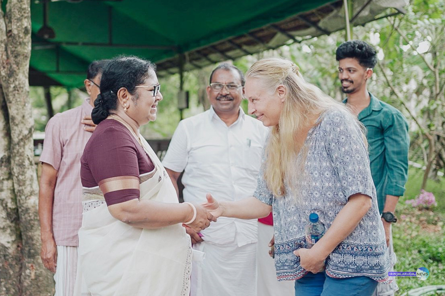 എല്ഡിഎഫ് സ്ഥാനാര്ഥി ആര്. ബിന്ദു മുരിയാട് വച്ച് വിദേശ വനിതയുമായി സൗഹൃദം പങ്കിടുന്നു.