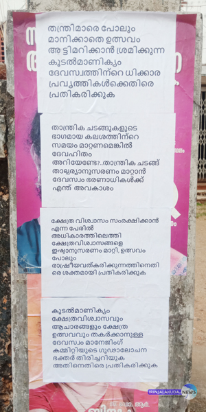 കൂടല്മാണിക്യം ക്ഷേത്രത്തിന് ചുറ്റും ദേവസ്വത്തിന്റെ നടപടികള്ക്കെതിരേ പ്രത്യക്ഷപ്പെട്ട പോസ്റ്ററുകള്.